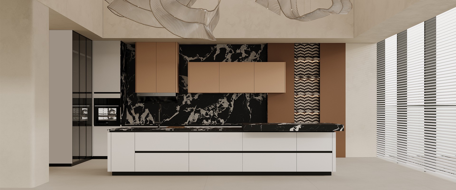 在廚柜設(shè)計中,地柜是采用抽拉方式,而吊柜采用的是平開方式,從設(shè)計美學(xué)來說,地柜是橫線條,吊柜是豎線條,歸納為“地橫吊豎